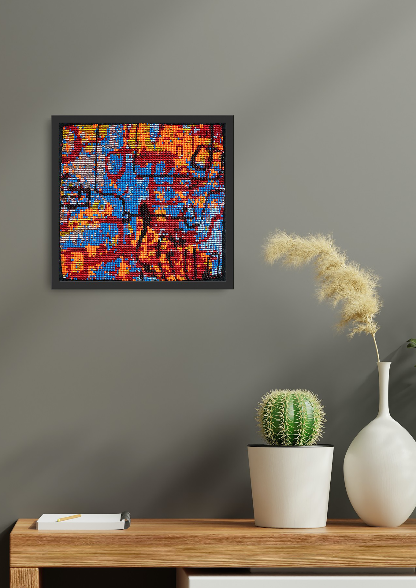 About the Collection: Handwoven on simple wooden looms by artisans in Bhavnagar, Gujarat, this piece embodies India’s fading bead-loom tradition. Tiny glass beads are woven into intricate patterns inspired by nature and geometry, preserving a craft once used to create torans that symbolized welcome and good fortune. Each artwork tells a quiet story — a meditative play of texture, light, and patience.