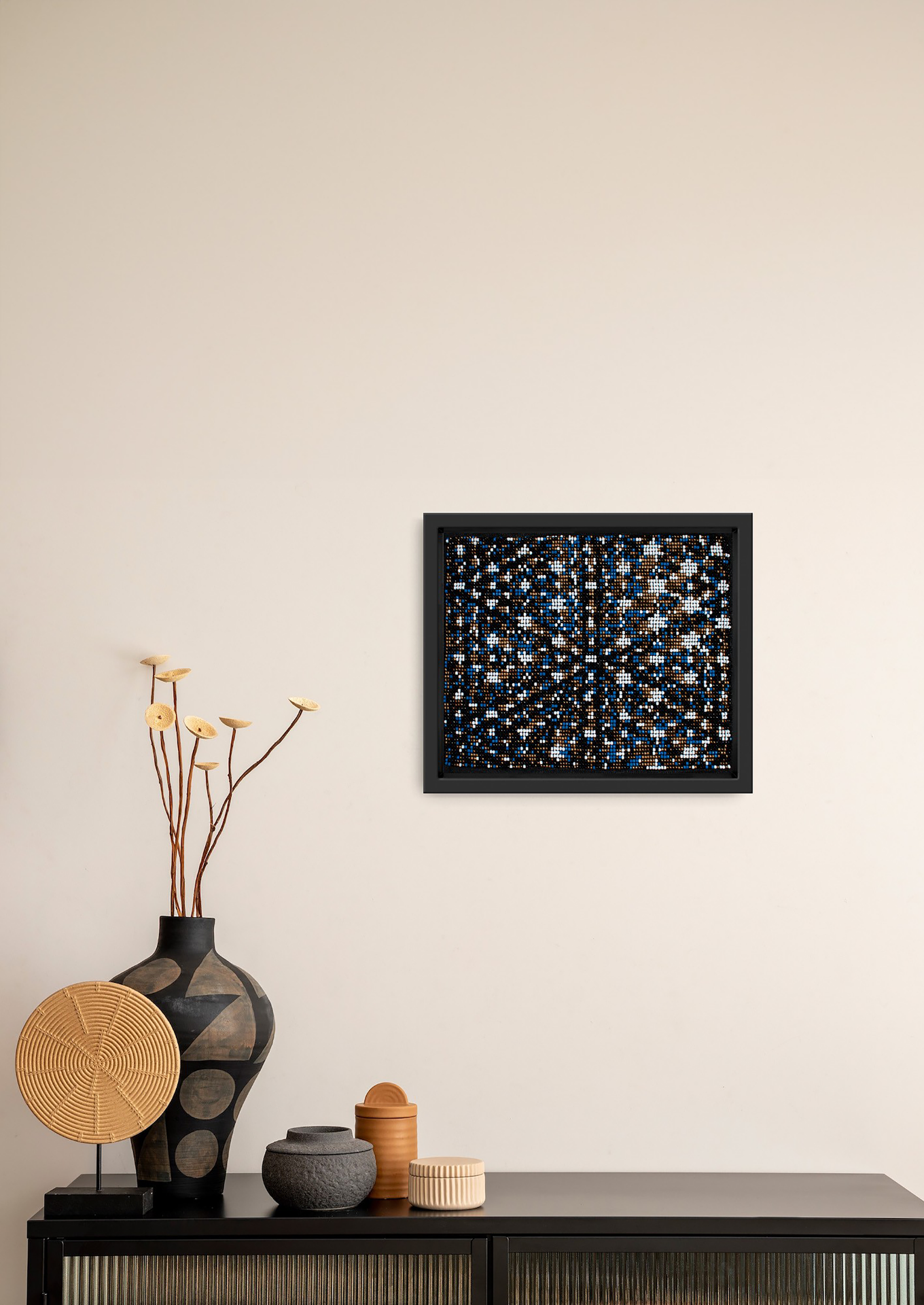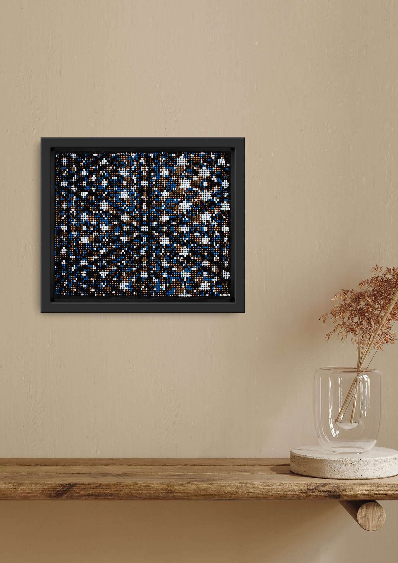 About the Collection: Handwoven on simple wooden looms by artisans in Bhavnagar, Gujarat, this piece embodies India’s fading bead-loom tradition. Tiny glass beads are woven into intricate patterns inspired by nature and geometry, preserving a craft once used to create torans that symbolized welcome and good fortune. Each artwork tells a quiet story — a meditative play of texture, light, and patience.