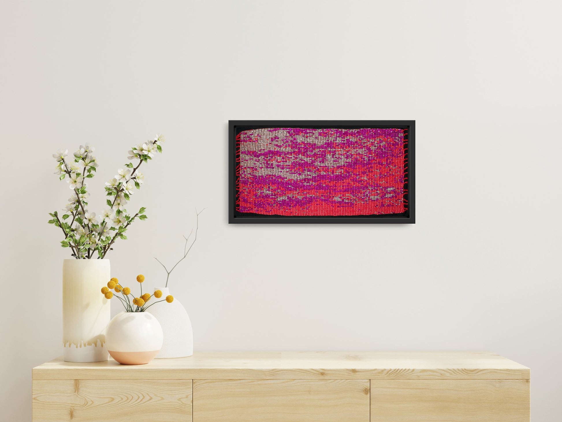 About the Collection: Handwoven on simple wooden looms by artisans in Bhavnagar, Gujarat, this piece embodies India’s fading bead-loom tradition. Tiny glass beads are woven into intricate patterns inspired by nature and geometry, preserving a craft once used to create torans that symbolized welcome and good fortune. Each artwork tells a quiet story — a meditative play of texture, light, and patience.
