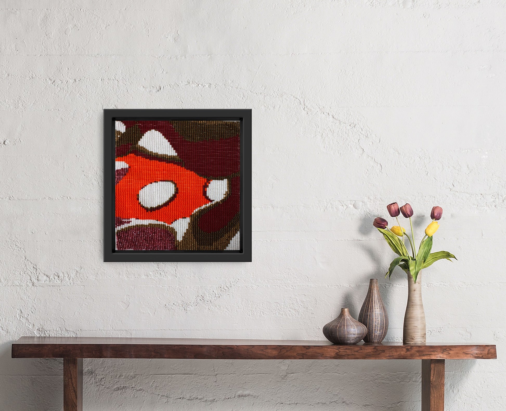About the Collection: Handwoven on simple wooden looms by artisans in Bhavnagar, Gujarat, this piece embodies India’s fading bead-loom tradition. Tiny glass beads are woven into intricate patterns inspired by nature and geometry, preserving a craft once used to create torans that symbolized welcome and good fortune. Each artwork tells a quiet story — a meditative play of texture, light, and patience.